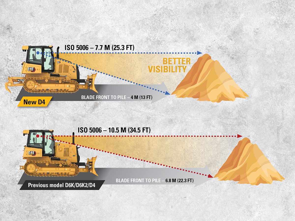 Seul élément extérieur visiblement redessiné (le reste se cache sous le capot et dans les performances) par rapport à son parent le D6K2, le D4 bénéficie d’un capot surbaissé qui offre une vue plongeante sur la zone de travail uniquement limité par la hauteur de sa lame. Le résultat : une visibilité améliorée de jusqu’à 30 % qui se traduit par 10 pieds gagnés* face au tracteur, et donc une sécurité renforcée sur les chantiers.